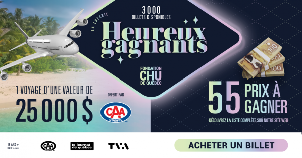 Du 6 novembre 2025 au 25 janvier 2026, procurez-vous un billet de la 19e édition Loterie Heureux Gagnant de la Fondation du CHU de Québec au coût de 150$.