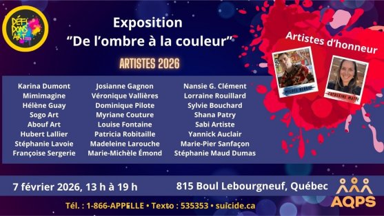 La 3e édition du Défi Dons Art se tiendra le 7 février 2026, de 13 h à 19 h, au 815 boul. Lebourgneuf. Un événement artistique et caritatif dédié à la prévention du suicide (AQPS). Cette année, nous sommes fiers de compter deux artistes d’honneur, Michel Blouin et Catherine Matte.